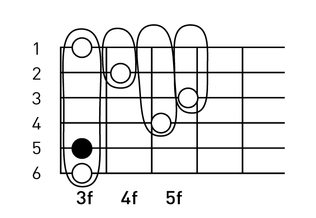 Cm 코드는 F코드와 마찬가지로 검지손가락으로 줄 전체를 누르는 하이 코드 모양입니다. 먼저, 검지와 엄지를 사용해서 집게처럼 3번 플렛 전체를 눌러줍니다. 이때 엄지손가락이 넥(neck) 중앙에 오도록 해주세요. 엄지손가락이 넥 위로 올라온 상태에서는 제대로 소리를 내기가 어렵습니다. 엄지손가락이 너무 내려가도 안 됩니다.