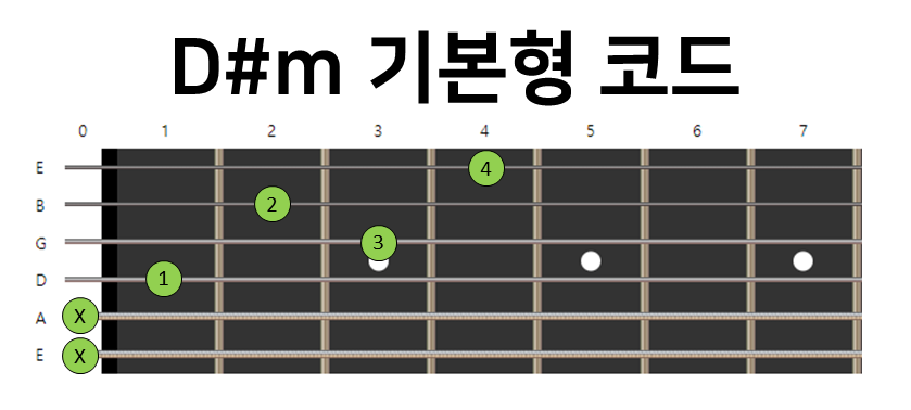 D#m는 일반적으로 하이코드(바레코드)를 사용해서 누르지만, 하이코드를 배우지 않았거나 덜 익숙한 분, 또는 하이코드 사용하기 싫으신 분들을 위한 코드가 있습니다. Dm 코드를 한 플랫씩 옮겨서 만든 코드인데요. 여기에 4번줄 근음(D#)을 검지손가락으로 눌러줌으로써 총 4개의 현을 울리는 코드입니다. 굵은 줄 1,2번은 뮤트음으로 치셔야 합니다.