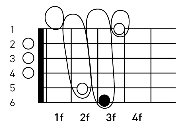 G코드의 구성음은 다음과 같습니다. 6번줄 3플렛 솔, 5번줄 2플렛 시, 4번줄 개방현 레, 3번줄 개방현 솔, 2번줄 개방현 시, 1번줄 3플렛 솔입니다.